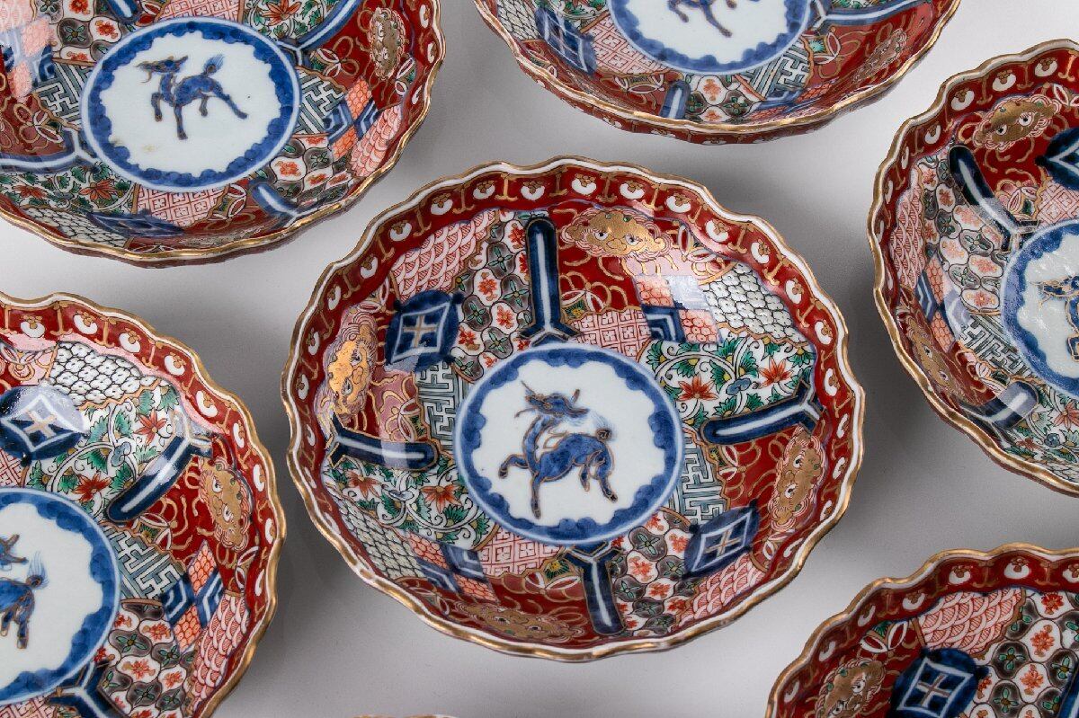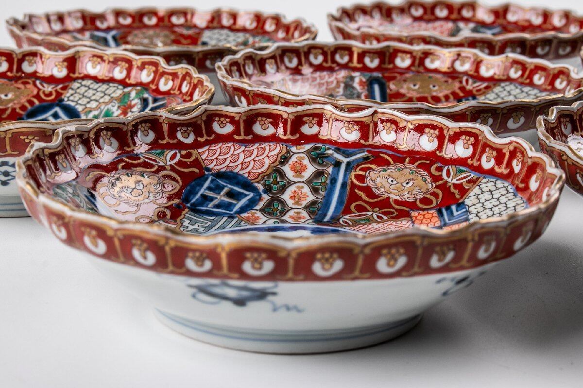 古伊万里 金襴手獅子麒麟瓔珞縁平皿 7客 明治時代 F495B バラ売り可能です