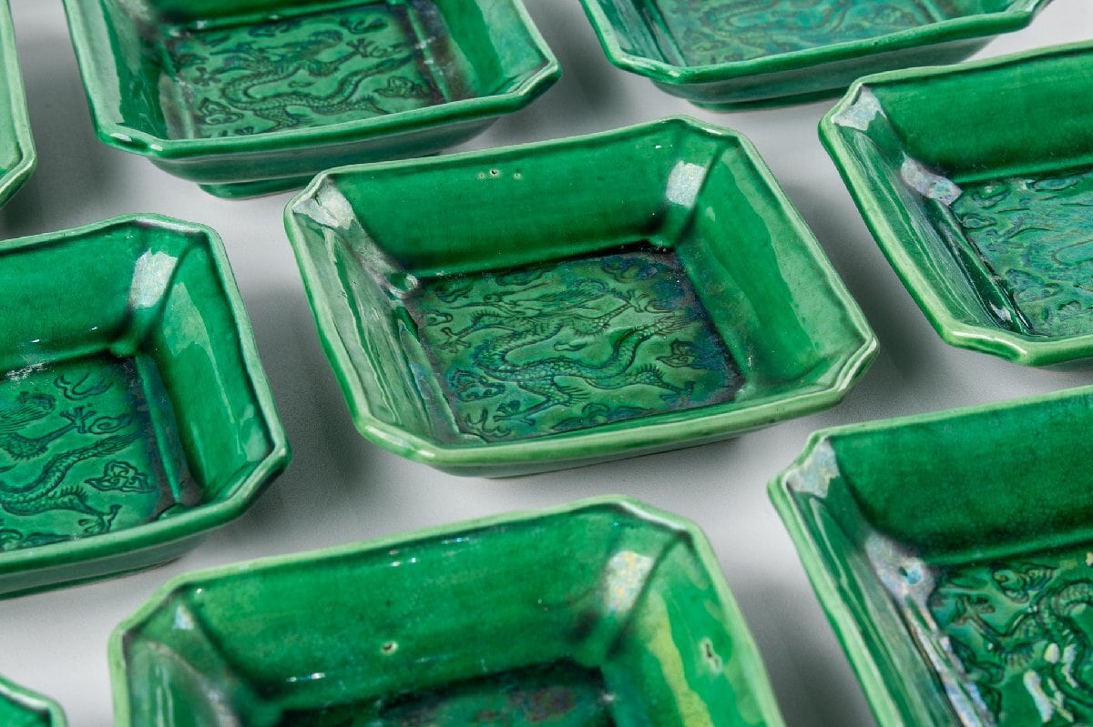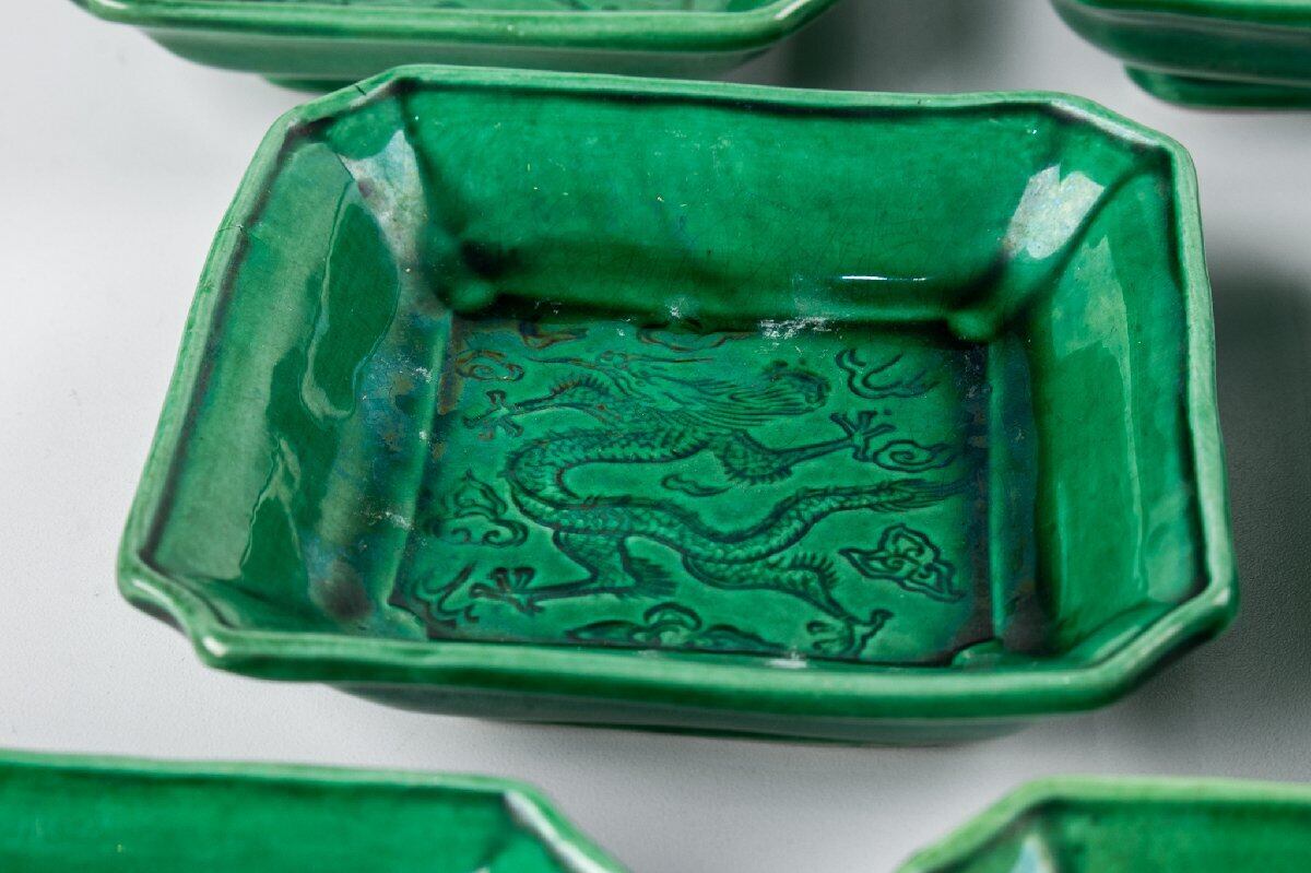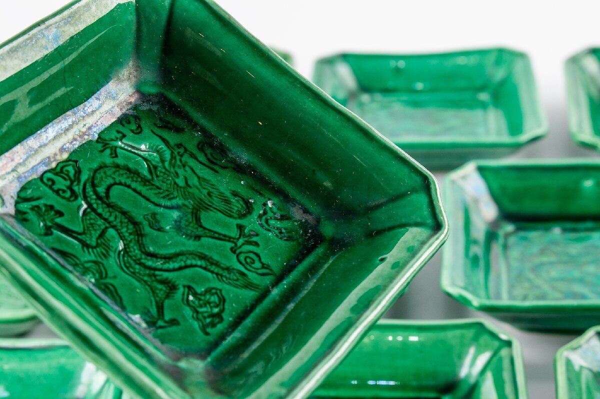 淡路焼 民平焼 緑釉雲龍陰刻角小皿 12客 F493 バラ売り可能です