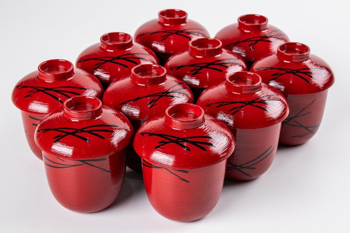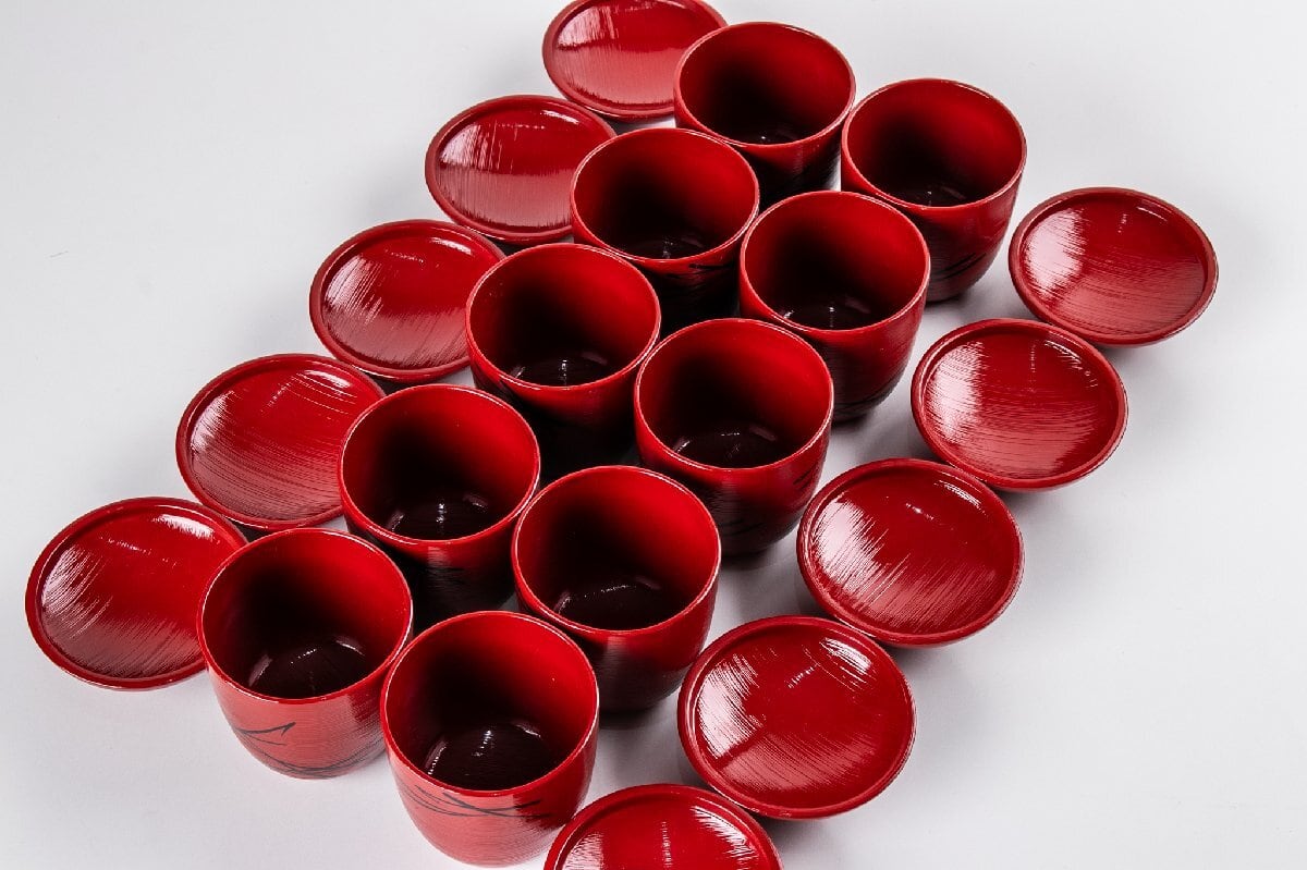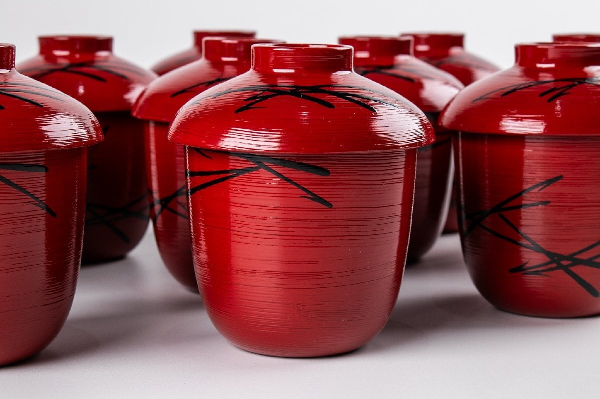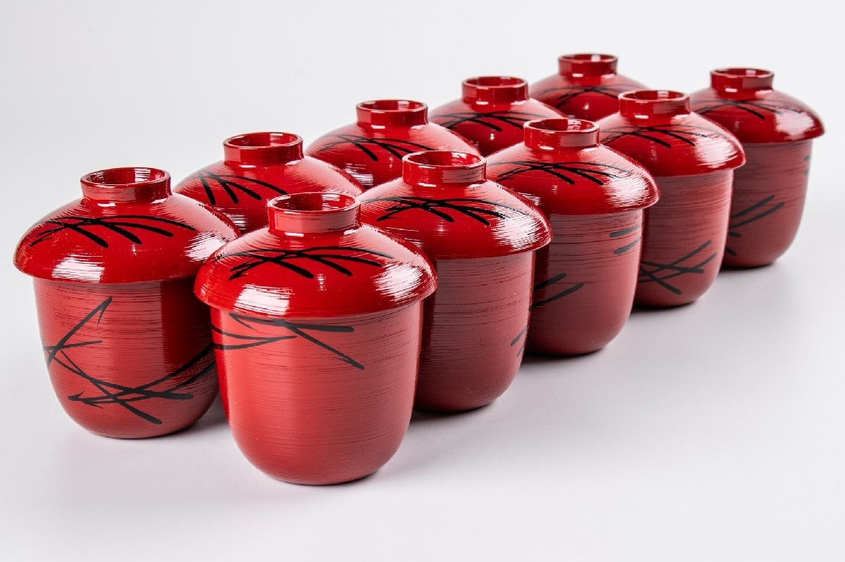 川端近左 朱松葉小吸物椀 10客 共箱 F550
