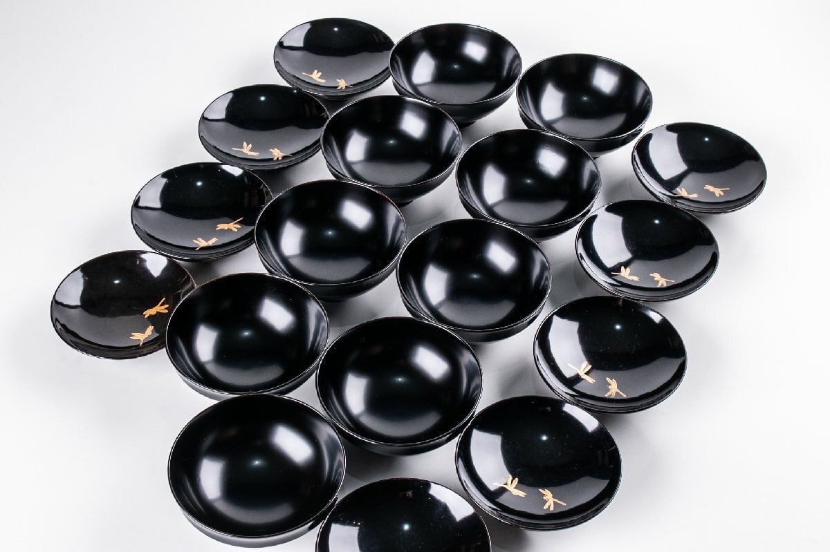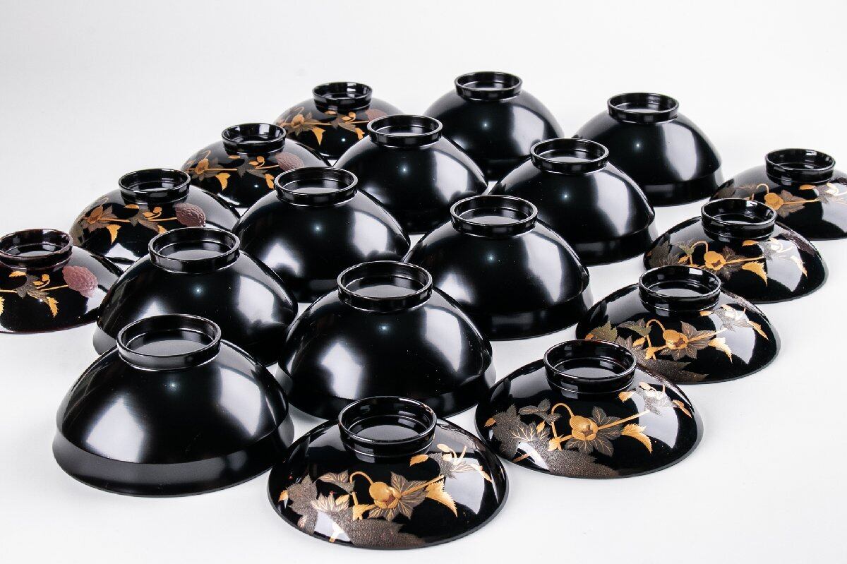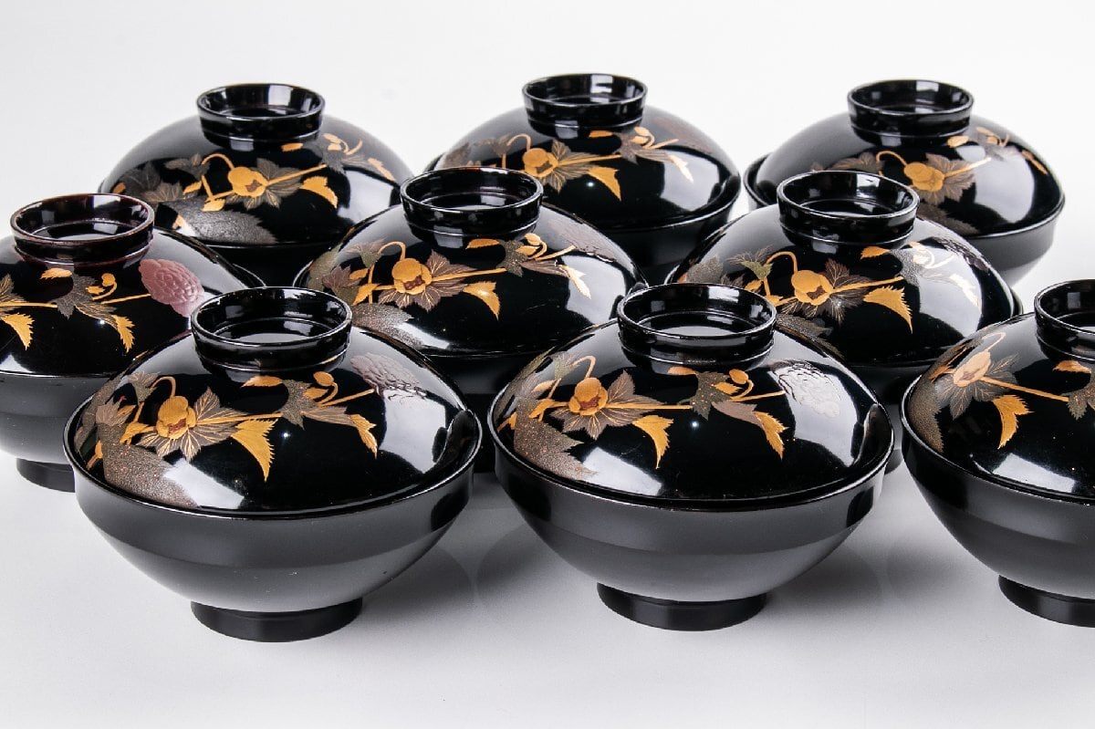 真塗 牡丹蒔絵吸物椀 9客 箱付 F579