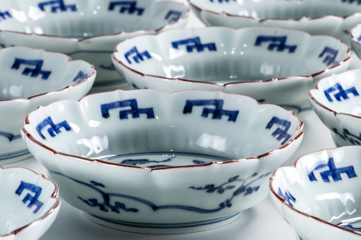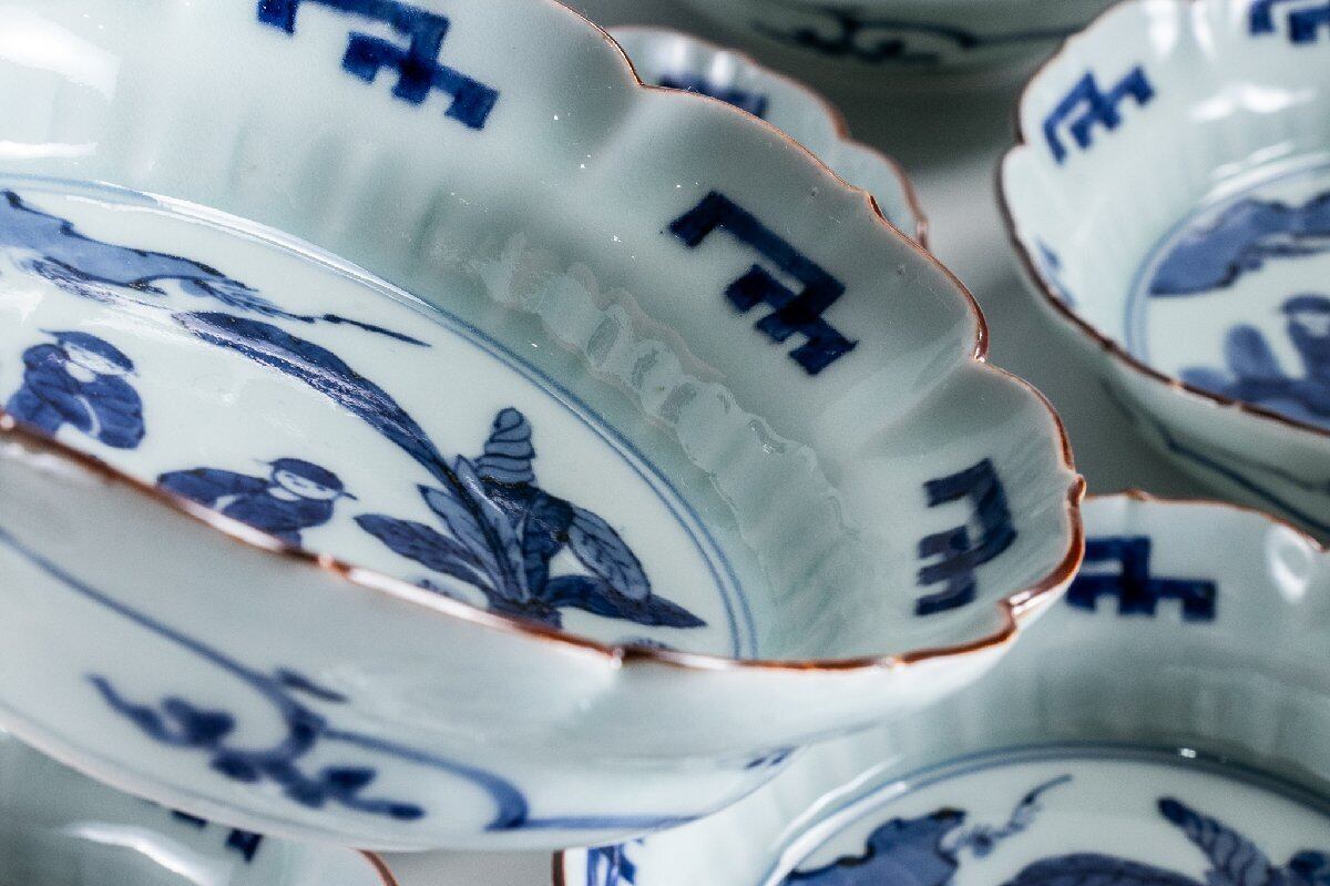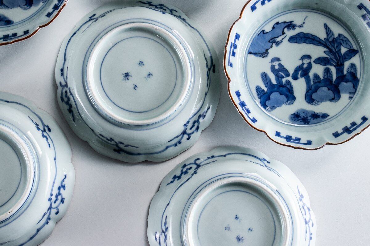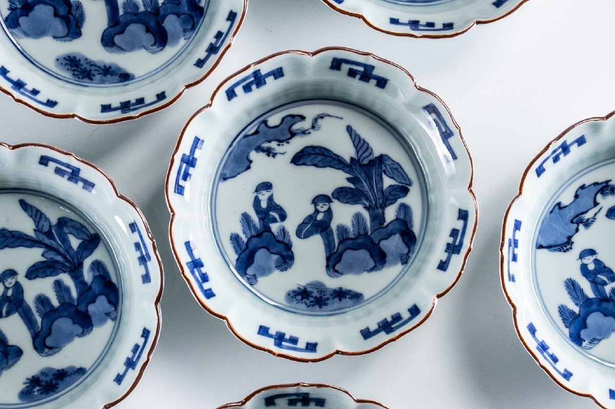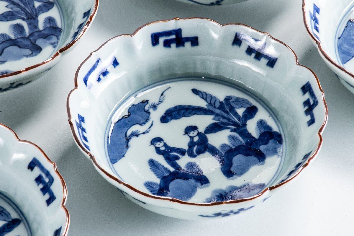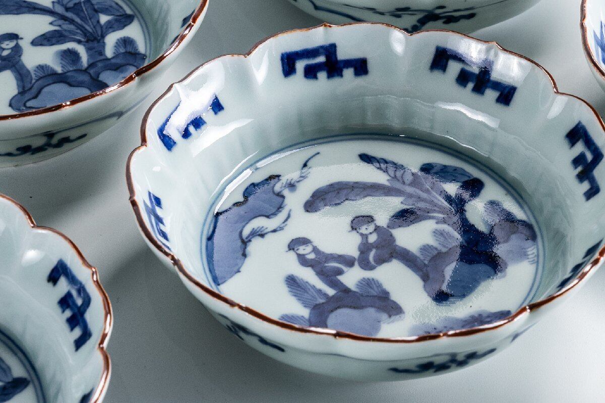 【うつわ】 古伊万里 染付草花人物文なます皿 7客 江戸後期 E098 バラ売り可能です