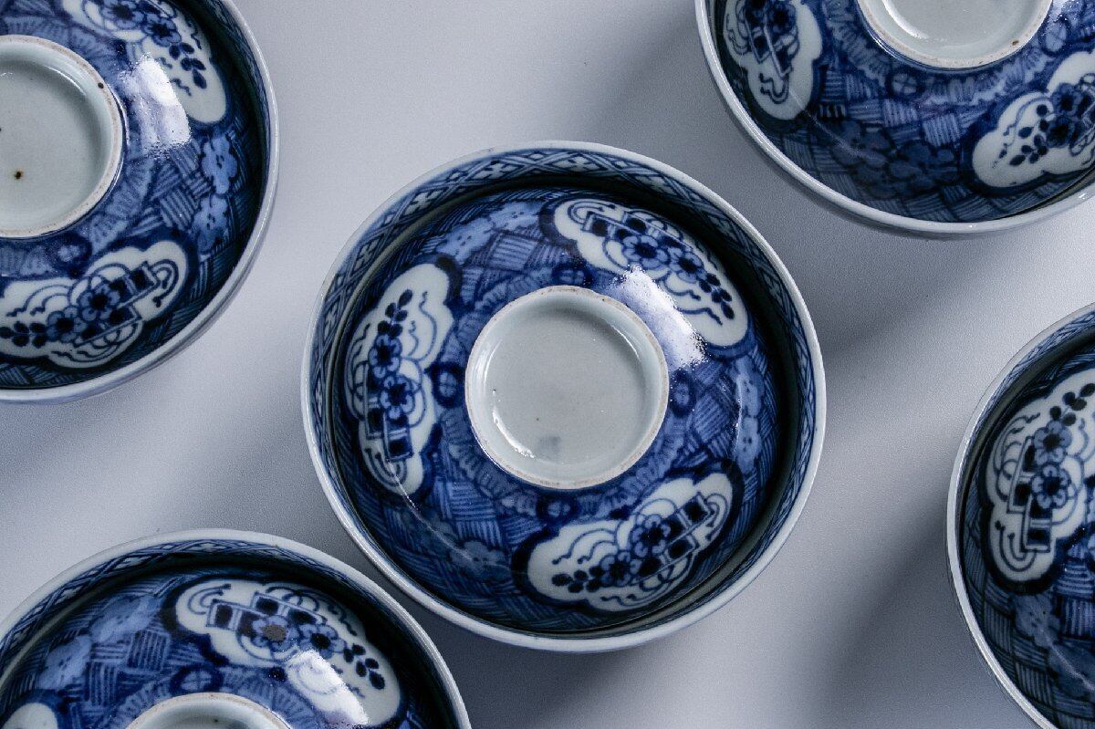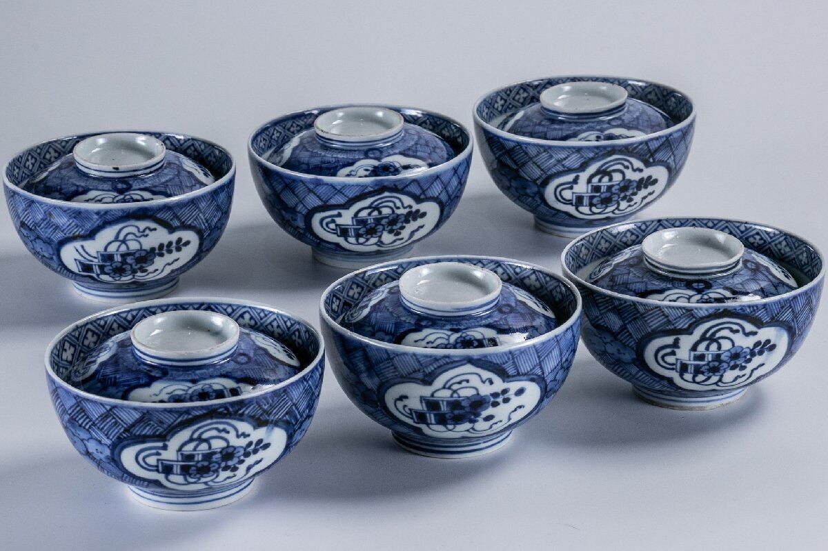 【うつわ】 古伊万里 染付更紗宝文蓋茶碗 6客 江戸後期 E244 バラ売り可能です