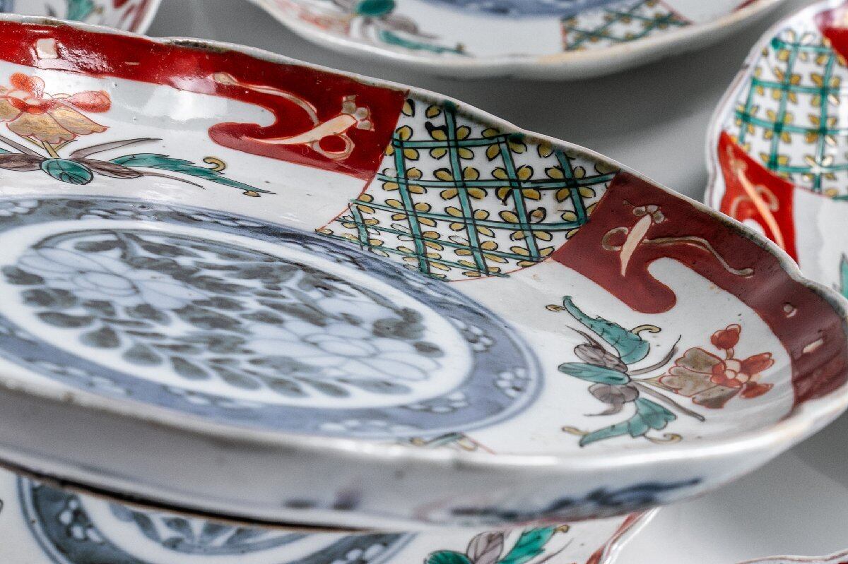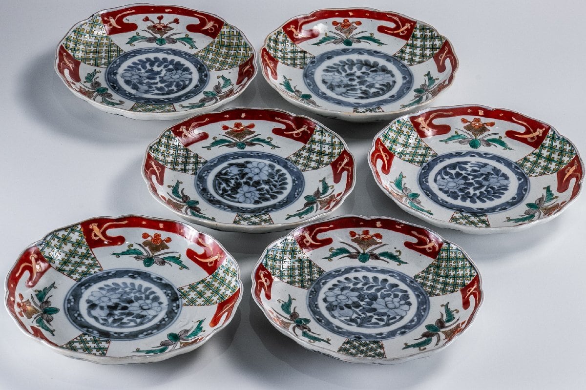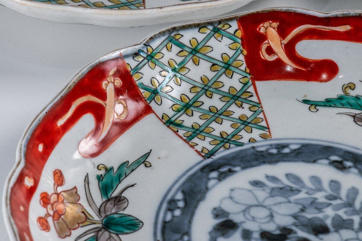 【うつわ】 古伊万里 染錦草花文七寸皿 5客 明治時代 E380A バラ売り可能です