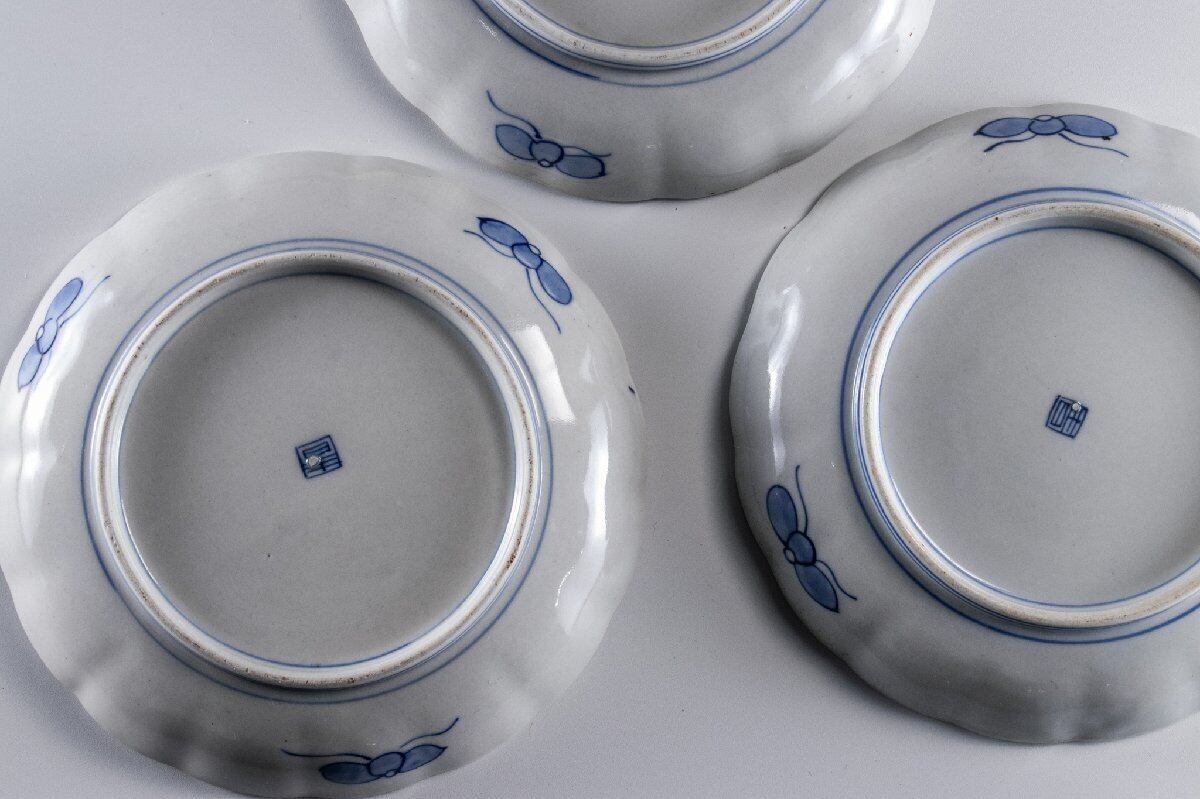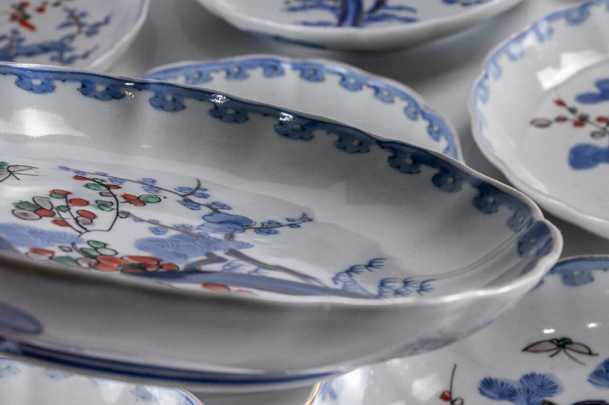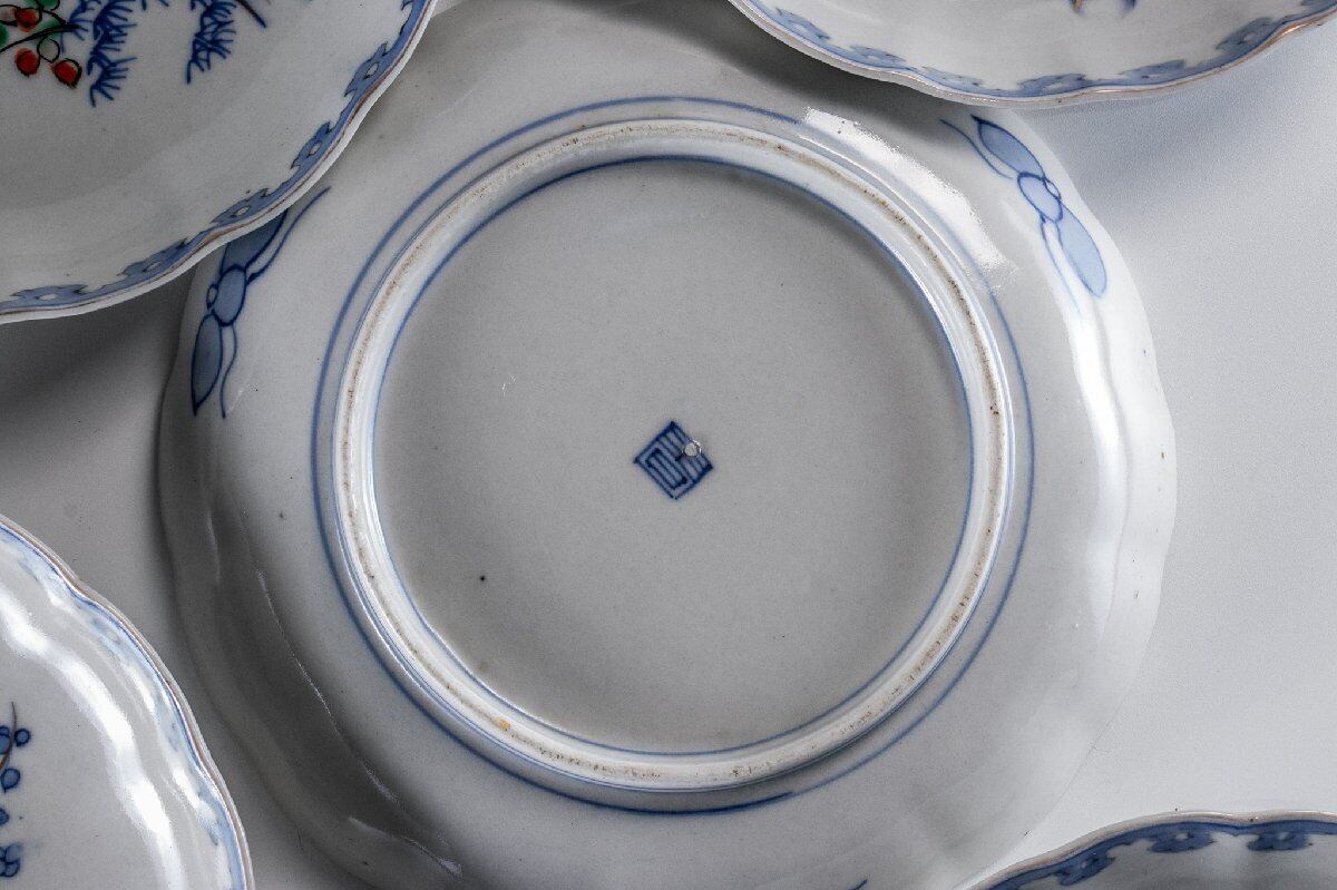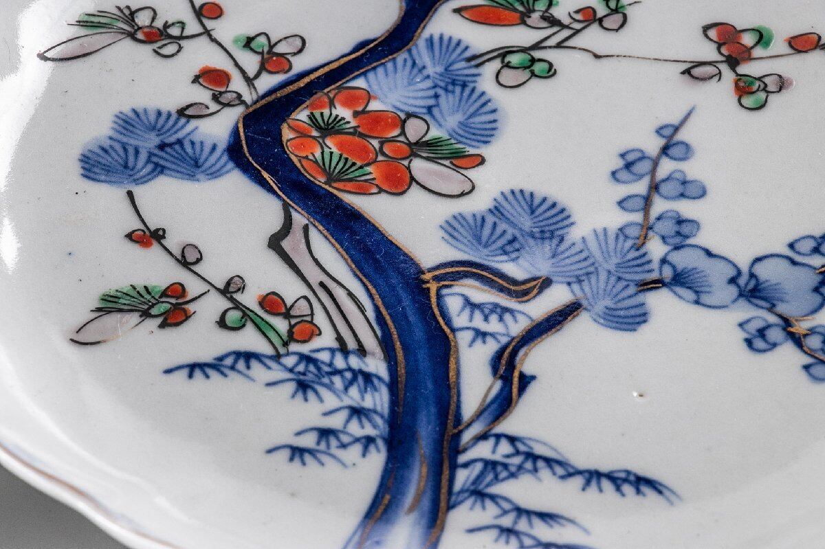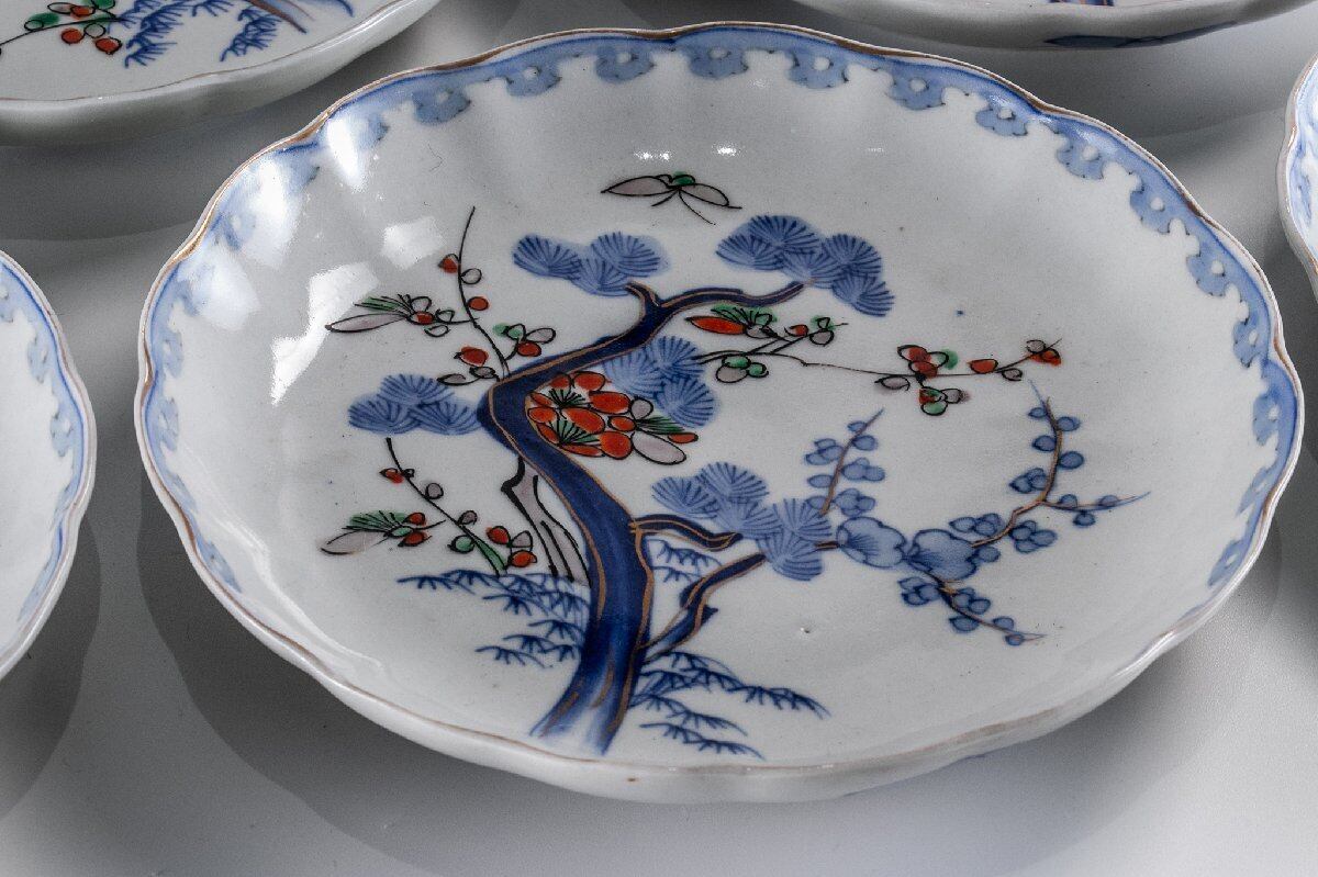 【うつわ】 古伊万里 染錦松竹梅蝶文七寸皿 4客 明治時代 E560 バラ売り可能です