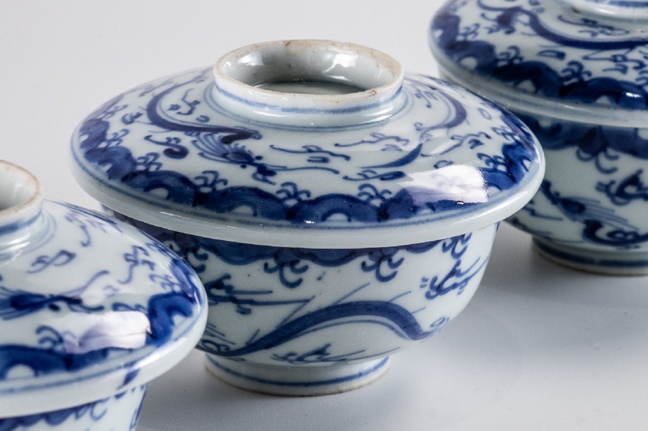 【うつわ】 古伊万里 染付雲龍文蓋茶碗 3客 江戸後期 E478 バラ売り可能です