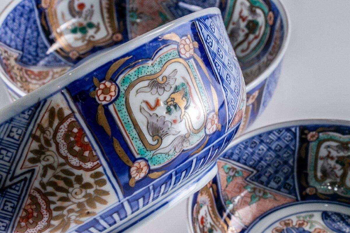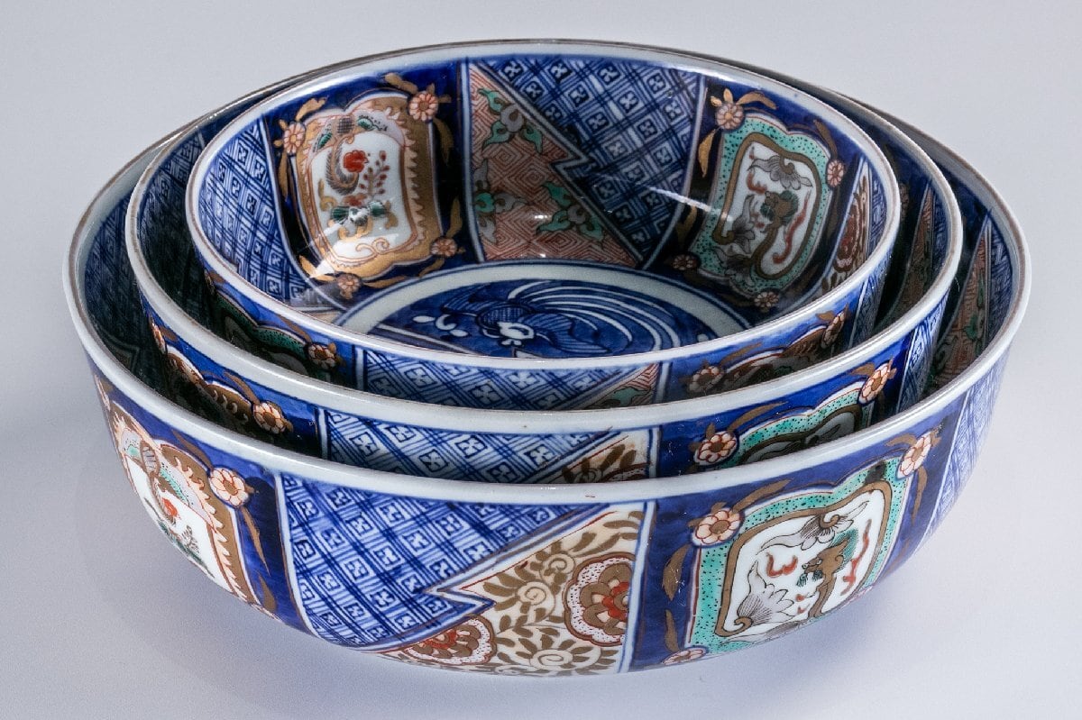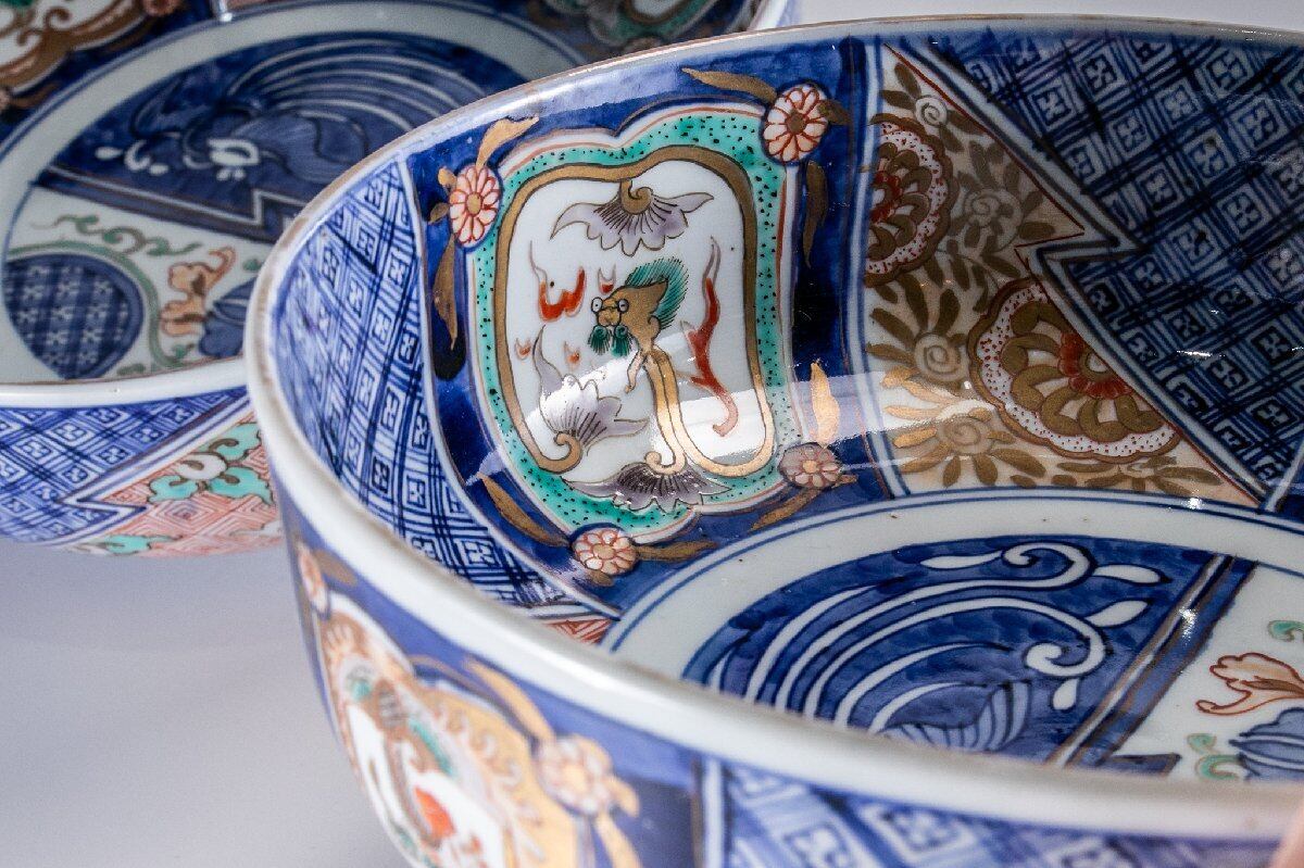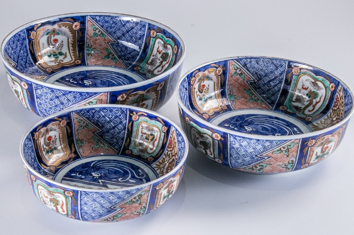 【うつわ】 古伊万里 染錦龍鳳凰更紗文三ツ鉢 明治時代 E670