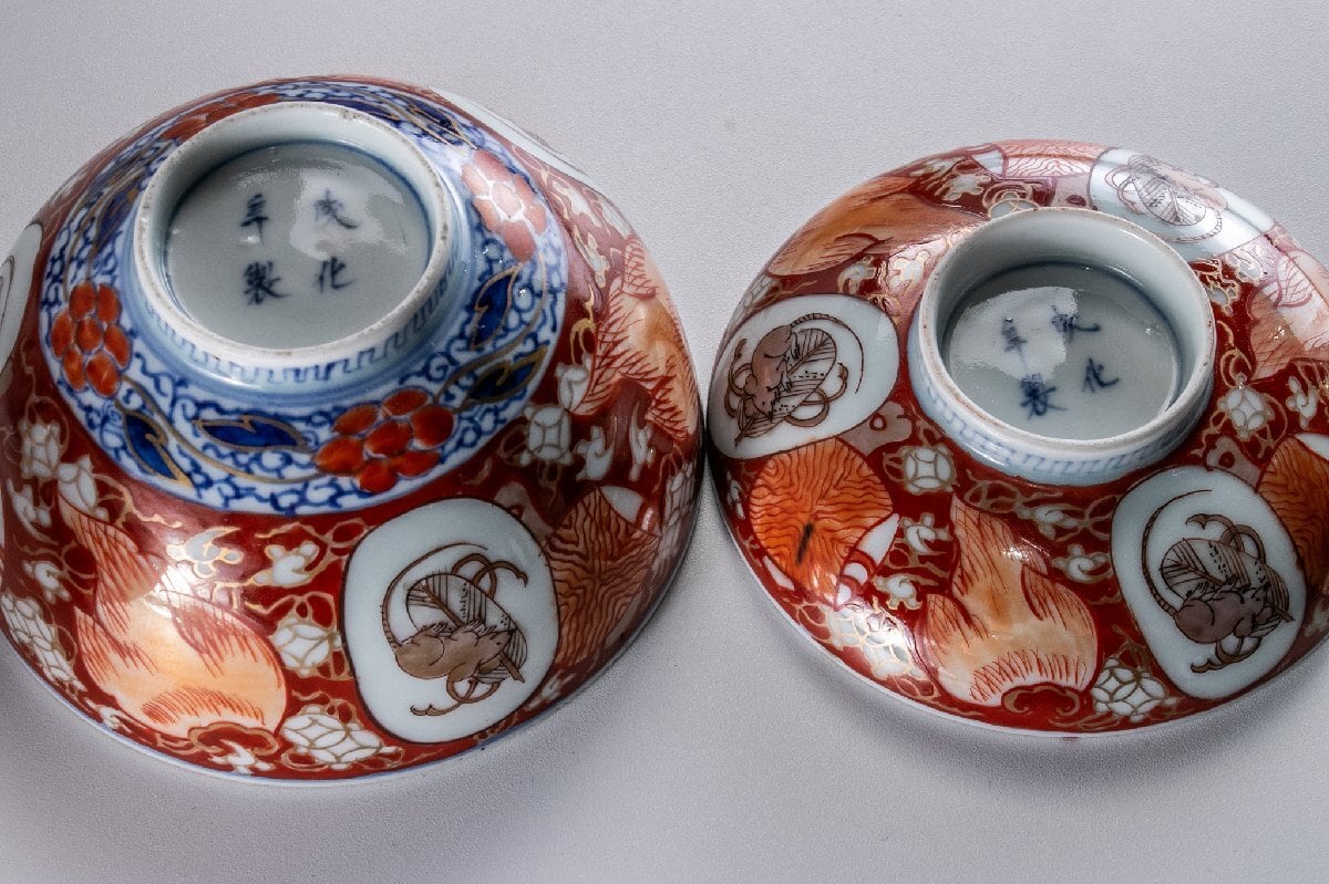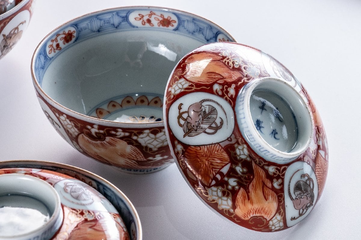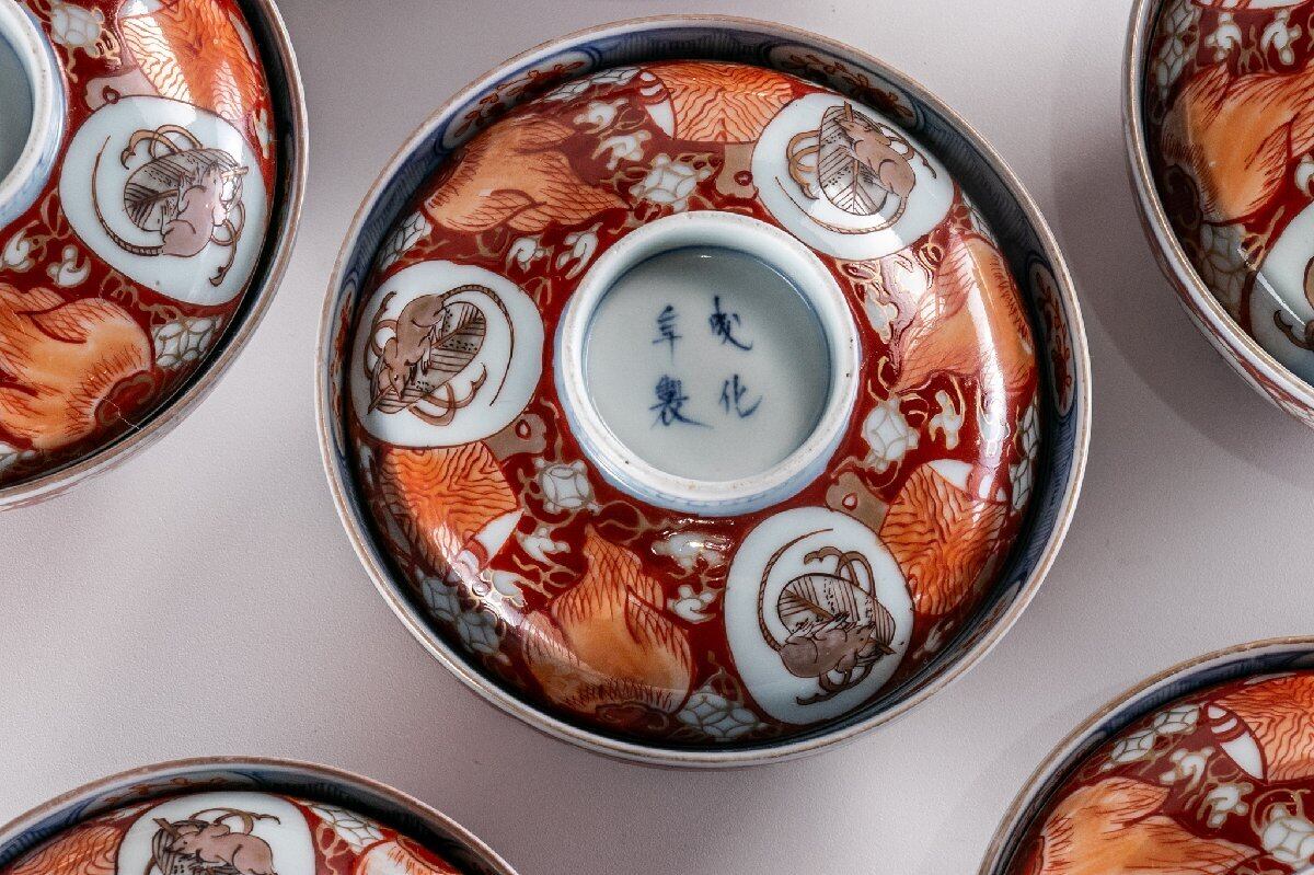 【うつわ】 古伊万里 染錦小槌鼠文蓋茶碗 7客 明治時代 E680B バラ売り可能です