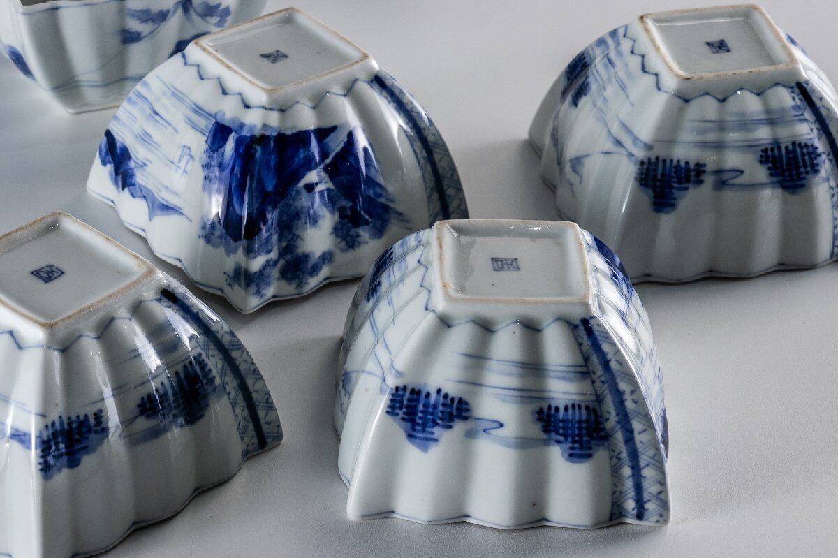 【うつわ】 古伊万里 染付富士柳下賢人図角向付 5客 江戸後期 E839A バラ売り可能です