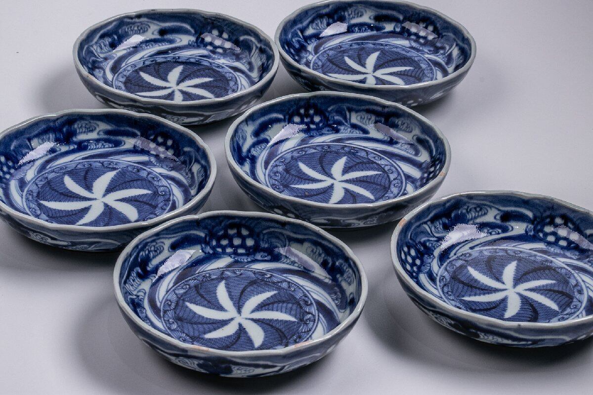 【うつわ】 古伊万里 染付流水亀文五寸皿 6客 江戸後期 E934B バラ売り可能です
