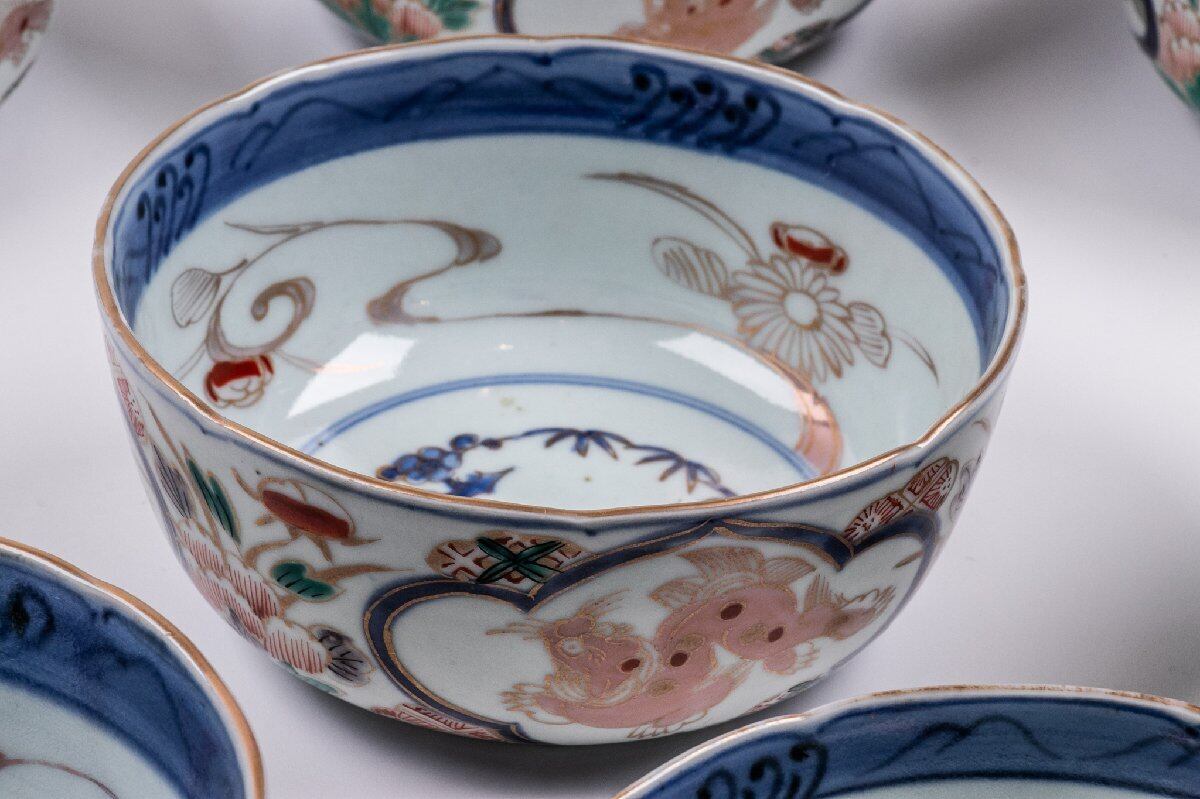 【うつわ】 古伊万里 染錦唐獅子牡丹三友文平鉢 8客 明治時代 E1244 バラ売り可能です